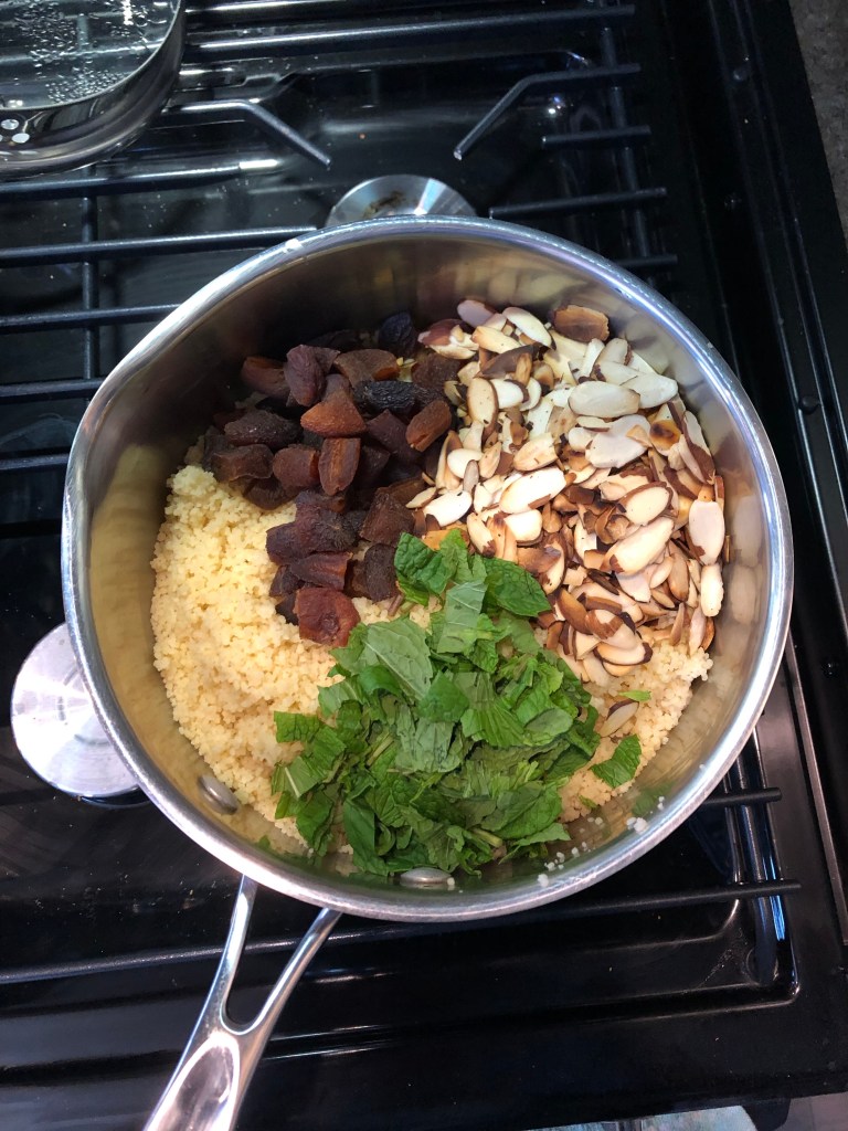 Add apricots, mint, olive oil, and almonds to the couscous. Make sure to stir it together. Season with salt and pepper.