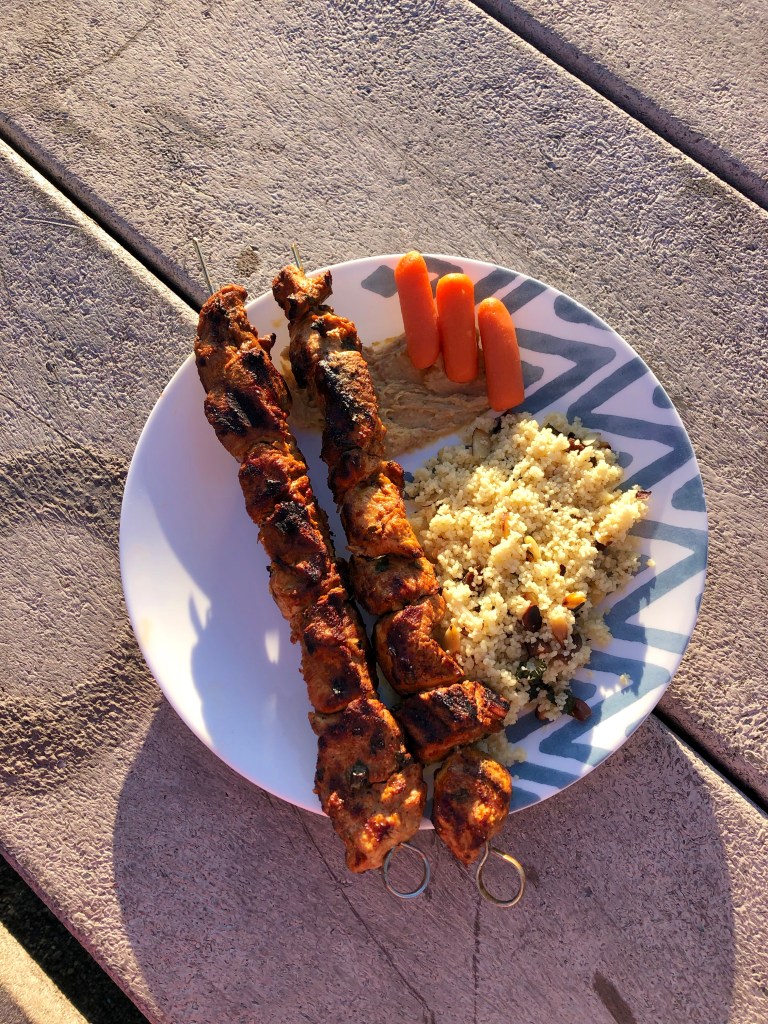 Once everything is completed, I added a smear of hummus to the plate along with some carrots. Finally, add the couscous and kebabs.
